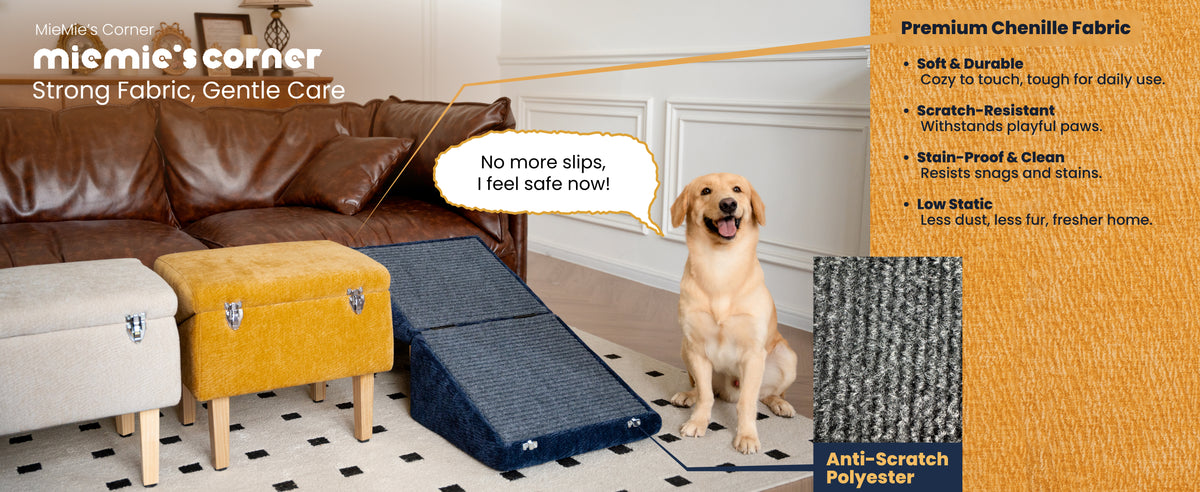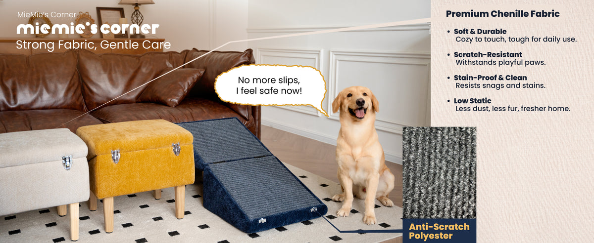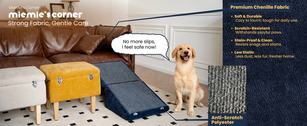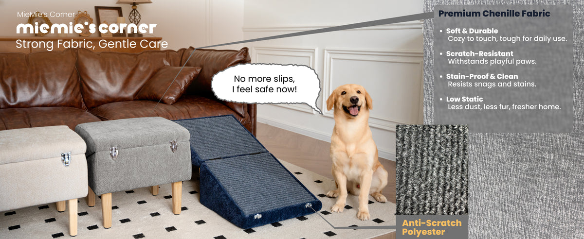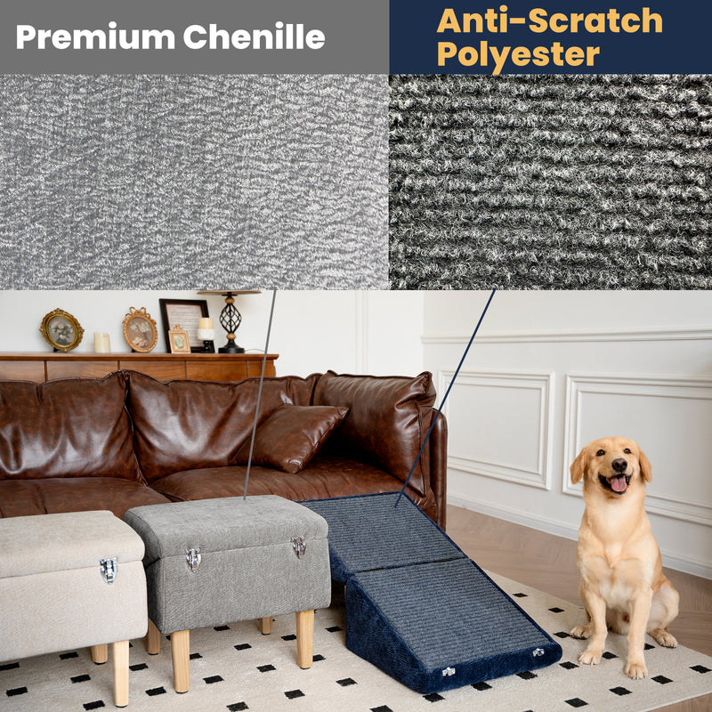 Premium chenille upholstery on the ottoman, anti-scratch polyester on the ramp surface, and solid pine legs—with a metal clasp for secure closure.